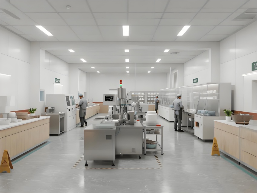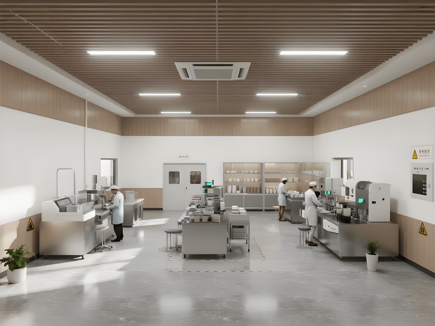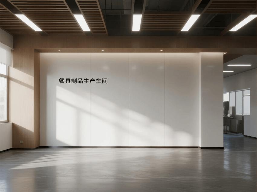 本餐具制品車間設(shè)計以現(xiàn)代簡約工業(yè)風(fēng)為核心,融合高效生產(chǎn)與視覺舒適性。色調(diào)以純凈白(墻面)、淺木色(倉儲柜)和不銹鋼銀灰(設(shè)備)為主,營造清爽專業(yè)的氛圍。