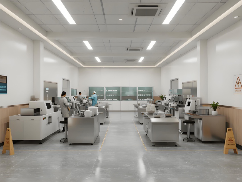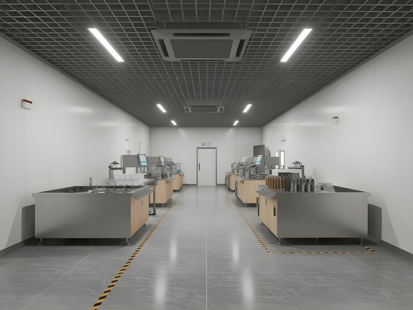 地面采用深灰色環(huán)氧防滑地坪,耐磨抗壓且易清潔;墻面使用白色抗污納米涂層鋼板,無縫拼接避免積灰;頂面設(shè)計為開放式黑色網(wǎng)格吊頂,裸露管線增強工業(yè)感,搭配高效LED條形燈帶提供無影照明。