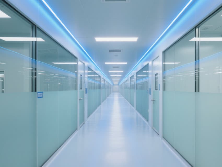 該醫(yī)藥廠潔凈車(chē)間以冰川白與醫(yī)用藍(lán)的漸變配色為主調(diào),營(yíng)造出純凈無(wú)菌的空間氛圍。墻面采用一體化抗菌板材,從頂部冰川白向地面醫(yī)用藍(lán)自然過(guò)渡,既符合GMP視覺(jué)規(guī)范,又強(qiáng)化了潔凈認(rèn)知。?