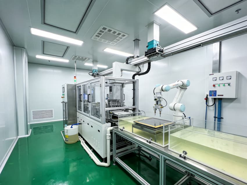 顯示器件制造廠房內部采用綠色地面與白色墻壁的簡約潔凈風格,精準匹配OLED、LCD等顯示器件生產對微塵、靜電、溫濕度的嚴苛要求。綠色地面選用防靜電高耐磨環氧自流平材質,經激光找平、防靜電涂層等多道精密工序處理,表面平整無縫,防靜電性能穩定,可有效規避靜電對顯示面板的損傷,同時具備強耐磨、易清潔特性,適配高頻次潔凈維護作業。