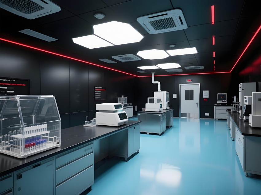 本實(shí)驗(yàn)室采用"生物防御未來(lái)主義"風(fēng)格,通過(guò)銳利的幾何切割與警示色彩構(gòu)建科研防護(hù)美學(xué)。核心實(shí)驗(yàn)區(qū)以啞光黑墻面搭配紅色應(yīng)急光帶,形成視覺(jué)危險(xiǎn)預(yù)警,與清潔區(qū)的