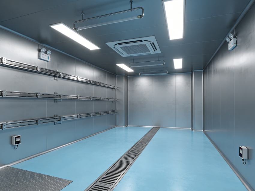 核心施工強化保溫隔熱基礎。圍護結構選用0.8mm厚彩鋼板,芯材導熱系數≤0.03W/(m·K),拼接處打滿專用密封膠,膠縫寬度3-5mm無氣泡;墻面與地面、吊頂交接處做圓弧處理,兼顧潔凈與保溫。地面采用保溫環氧自流平,基層鋪設保溫層,減少地面熱傳導;門窗選用斷橋鋁+雙層中空Low-E玻璃,配備雙層密封膠條,杜絕冷熱交換導致的溫濕波動。
